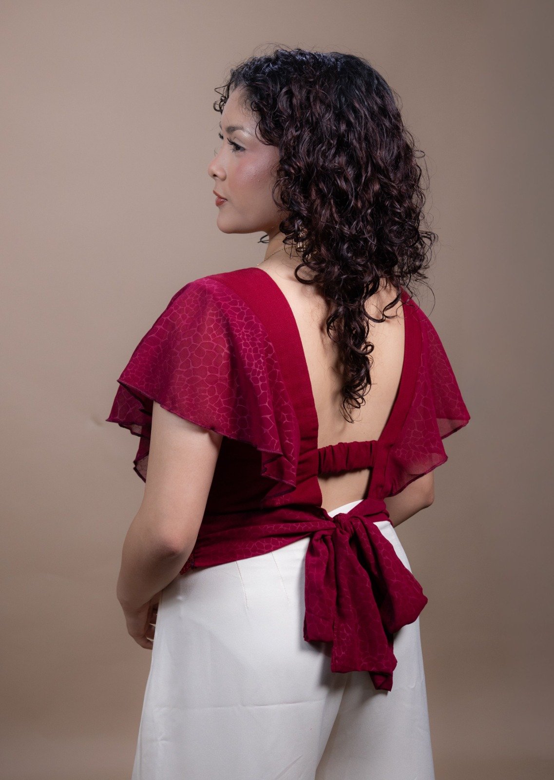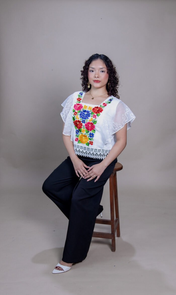 Esta blusa está fabricada en una fresca tela de lino con algodón y decorada con bordados a máquina de pedal en técnica de rayitas. El diseño cuenta con unas llamativas mangas de olanes hechas en tela de seda que le dan mucho movimiento. En la parte de atrás, tiene un bonito escote y un ajuste en la cintura para resaltar la figura, combinando comodidad y un estilo artesanal único.